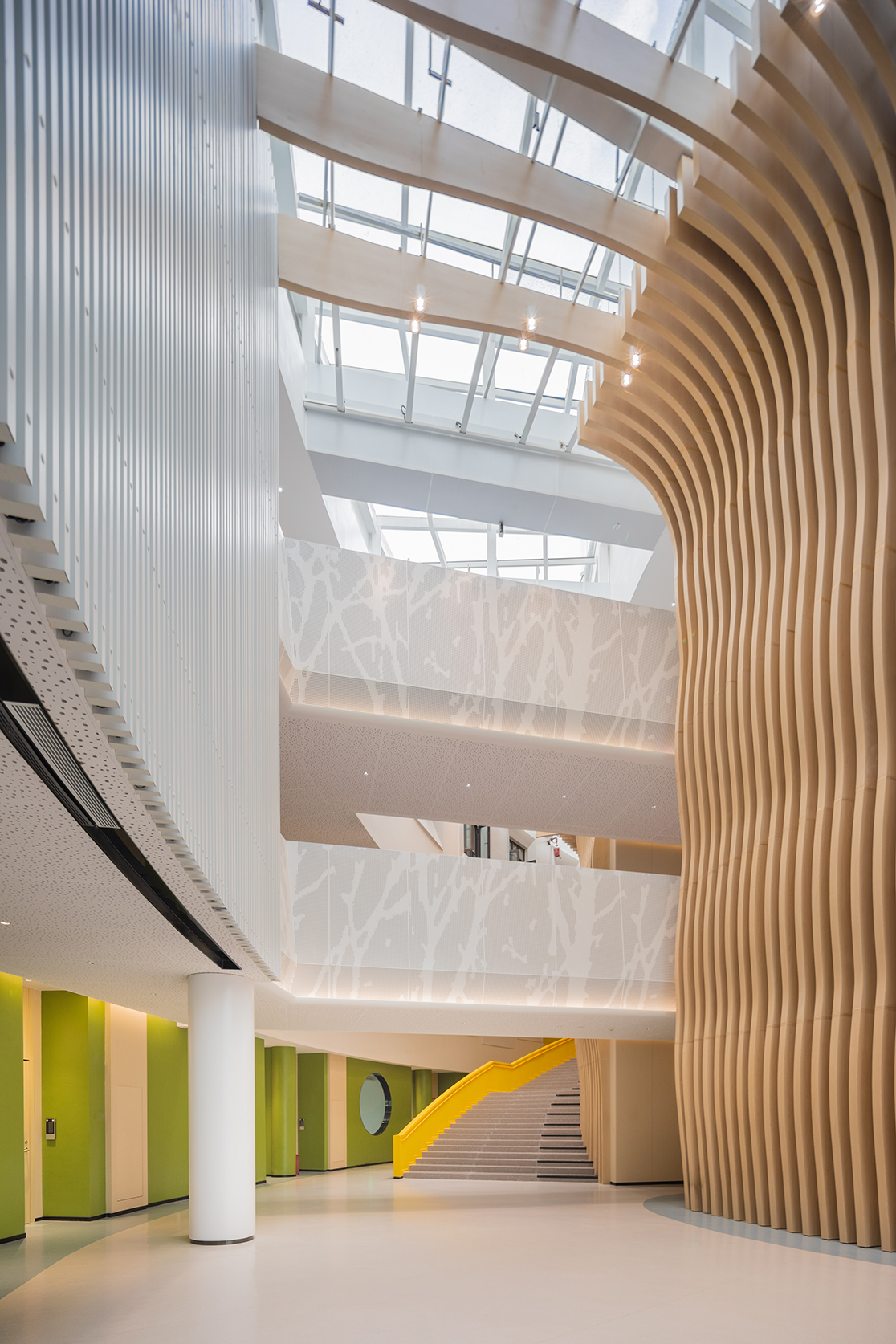 博雅樓是亮亮中學(xué)的科技藝術(shù)區,室內設計及施工融合”景觀(guān)+生態(tài)+文化”三大元素,特別是在中庭區域,“樹(shù)狀”造型包繞著(zhù)整個(gè)墻面,充分展現了這座建筑的藝術(shù)沉浸感。但面對弧形的墻面、復雜的形態(tài)及高低起伏的樓梯,異形鋁方通的下單制作及安裝便成了整個(gè)區域一大難題。港源裝飾項目團隊以豐富的施工經(jīng)驗,充分考慮了鋁方通重量及變形度,在現場(chǎng)對原設計圖紙重新排版分段,反復精細測試,最終完美呈現出這片高達14米的樹(shù)狀造型。