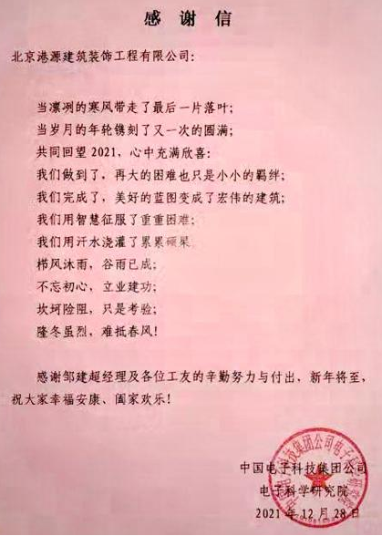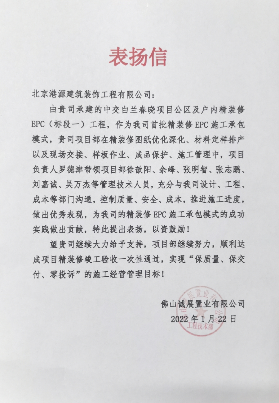一封封表?yè)P信、感謝信,是對港源品牌的認可,也是對全體項目管理人員付出的肯定,更是鞭策我們不斷提高服務(wù)質(zhì)量的動(dòng)力。在今后的施工管理服務(wù)中,北京港源將堅持以“讓客戶(hù)更滿(mǎn)意”為宗旨,以適應客戶(hù)的多樣化需求。
