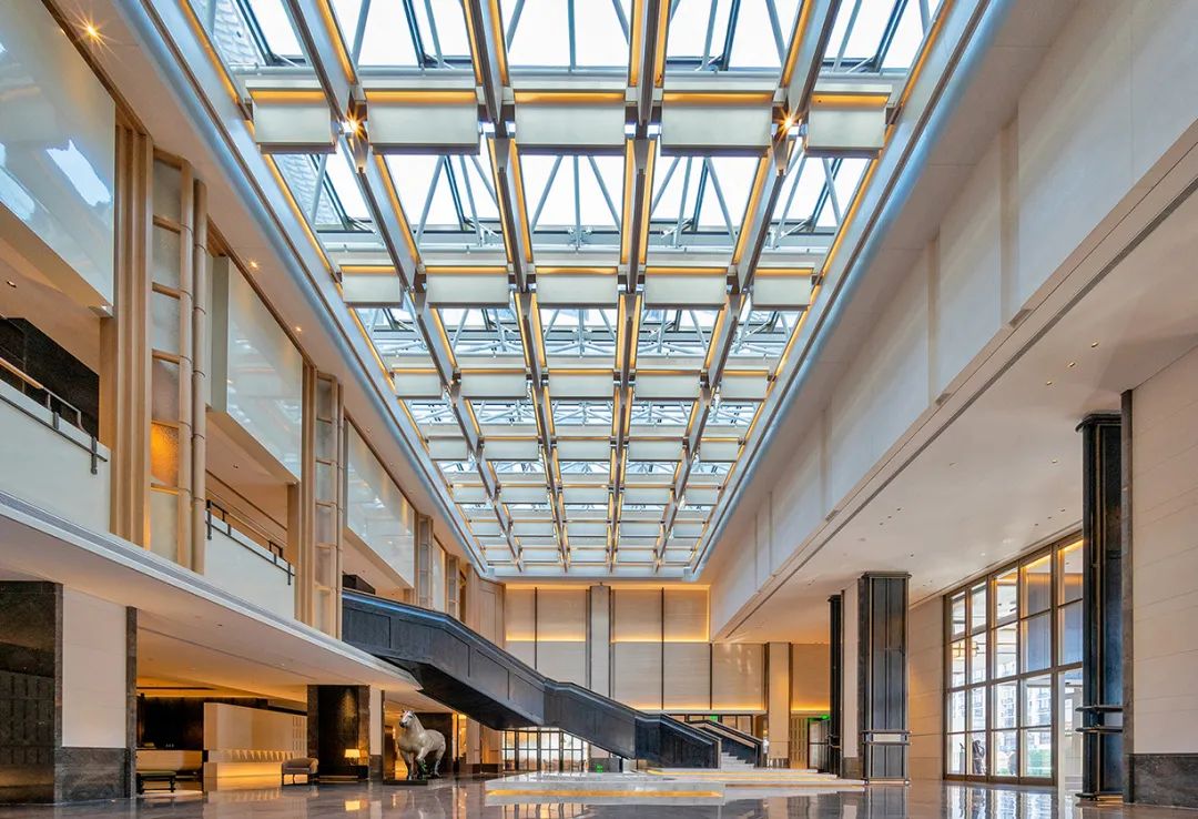 挑高約10米,頂部為造型復雜的鋁板采光頂