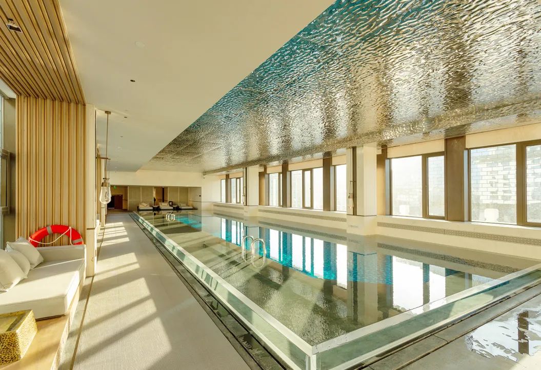 高層泳池位于酒店五樓,在擴大使用面積的同時(shí)升級改造為無(wú)邊泳池,屬于酒店施工的重點(diǎn)控制區域。港源項目團隊在泳池施工過(guò)程中嚴格把關(guān),采用透明材質(zhì)作為護欄,當池水恰好漫過(guò)護欄便呈現出無(wú)邊水面效果,完美實(shí)現了設計初衷。
